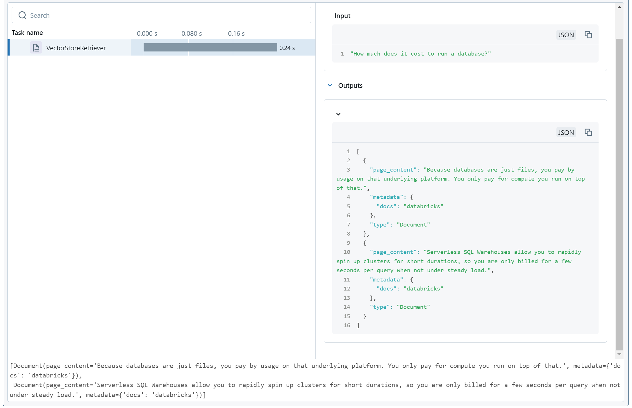 Document(page_content='Because databases are just files, you pay by usage on that underlying platform. You only pay for compute you run on top of that.', metadata={'docs': 'databricks'})